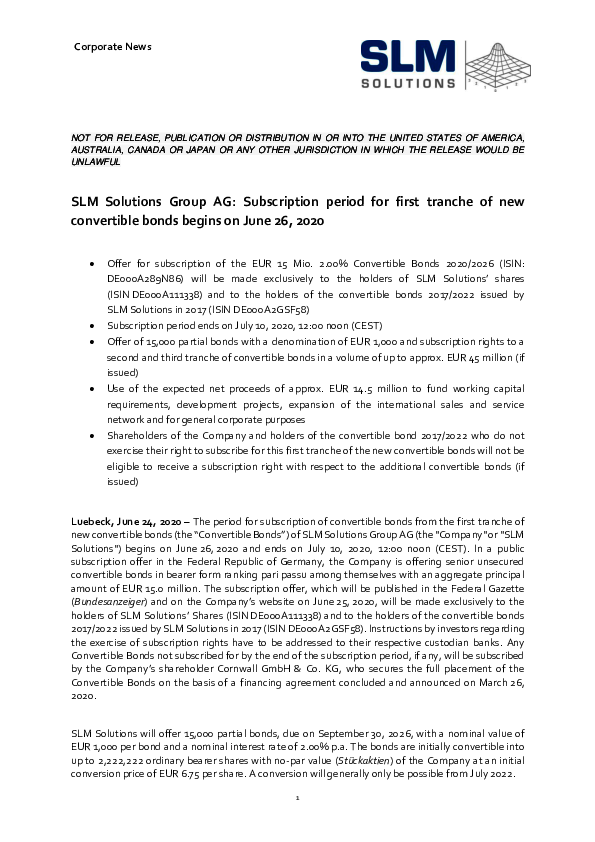 Luebeck, June 24, 2020 – The period for subscription of convertible bonds from the first tranche of new convertible bonds (the “Convertible Bonds”) of SLM Solutions Group AG (the "Company" or "SLM Solutions") begins on June 26, 2020 and ends on July 10, 2020, 12:00 noon (CEST). In a public subscription offer in the Federal Republic of Germany, the Company is offering senior unsecured convertible bonds in bearer form ranking pari passu among themselves with an aggregate principal amount of EUR 15.0 million. The subscription offer, which will be published in the Federal Gazette (Bundesanzeiger) and on the Company’s website on June 25, 2020, will be made exclusively to the holders of SLM Solutions’ Shares (ISIN DE000A111338) and to the holders of the convertible bonds 2017/2022 issued by SLM Solutions in 2017 (ISIN DE000A2GSF58). Instructions by investors regarding the exercise of subscription rights have to be addressed to their respective custodian banks. Any Convertible Bonds not subscribed for by the end of the subscription period, if any, will be subscribed by the Company’s shareholder Cornwall GmbH & Co. KG, who secures the full placement of the Convertible Bonds on the basis of a financing agreement concluded and announced on March 26, 2o2o.
