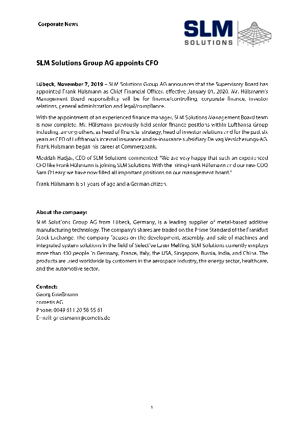 Lübeck, November 7, 2019 – SLM Solutions Group AG announces that the Supervisory Board has appointed Frank Hülsmann as Chief Financial Officer, effective January 01, 2020. Mr. Hülsmann’s Management Board responsibility will be for finance/controlling, corporate finance, investor relations, general administration and legal/compliance.