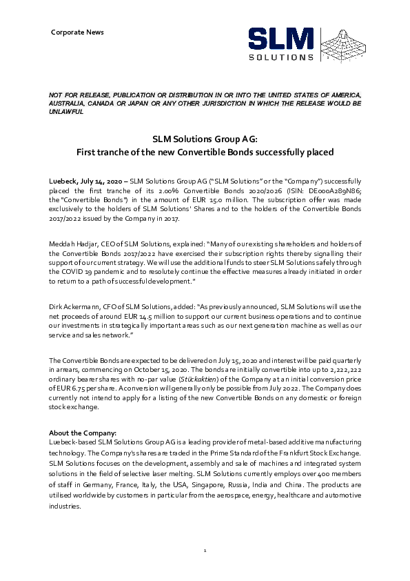 Luebeck, July 14, 2020 – SLM Solutions Group AG (“SLM Solutions” or the “Company”) successfully placed the first tranche of its 2.00% Convertible Bonds 2020/2026 (ISIN: DE000A289N86; the "Convertible Bonds") in the amount of EUR 15.0 million. The subscription offer was made exclusively to the holders of SLM Solutions' Shares and to the holders of the Convertible Bonds 2017/2022 issued by the Company in 2017.