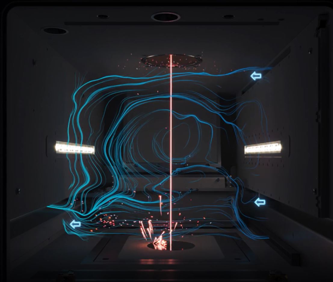 The permanent filter module traps process soot in a sintered plate filter that is purged with safety gas. The waste material is coated with an inhibitor and stored in a bin for dry disposal, while clean gas returns to the process chamber, stabilizing gas flow to ensure part quality throughout long builds without interruption. The elimination of consumable filter cartridges increases safety while improving machine uptime and reducing costs.