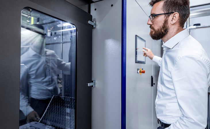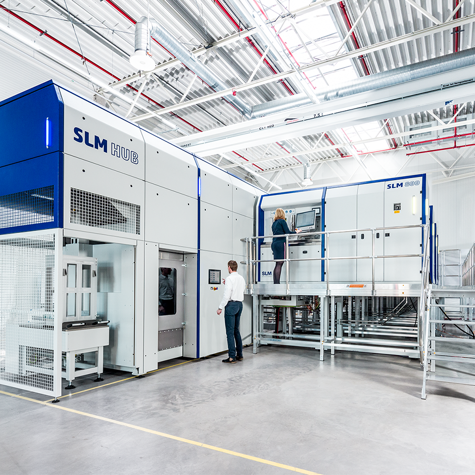 Up to five SLM®800 systems can be modularly connected to and operated from a single SLM®HUB. With a build cylinder magazine (BCM) multiple build cylinders can be handled in parallel to optimize machine uptime and scale to full production